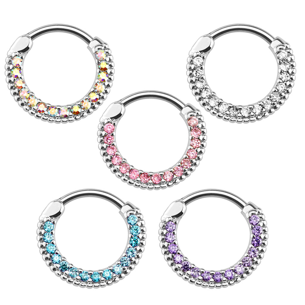 Tā loks ir dekorēts ar kristāliem, kuri ir pieejami piecās dažādās krāsās. Kristāli ir ieklāti līdz stienītim; pēc ievietošanas septum pīrsingā, būs redzami tikai kristāli, kuri mirgos burvīgā gaismas spēlē. Neatkarīgi no izvēlētās krāsas, visos modeļos gan augšdaļā, gan apakšdaļā ir nelieli punktiņi. Šīm septum klikerim ir elegants un rūpīgi detalizēts dizains.