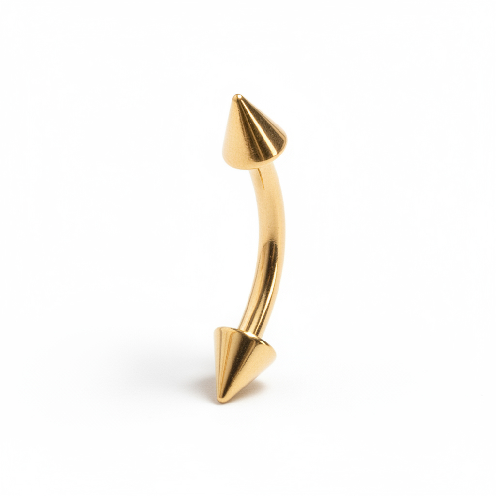 Vai jūs vēlaties piešķirt savam uzacs vai krūtsgala pīrsingam jaunu izskatu? Šis satriecošais izliektais stienītis ir apzeltīts un rotāts ar dzeloņveida uzgaļiem, katrā tā galā. Tas ir pieejams divos dažādos biezumos un garumos, tādēļ lieliski derēs jūsu pīrsingam. Izliektie stienīši ir izcila izvēle intīmajiem pīrsingiem, tādēļ, neatkarīgi no tā, kāds ķermeņa pīrsings jums ir, apskatiet šo skaisto stienīti.