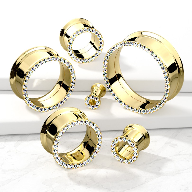 Šis tunelis ir izgatavots no apzeltīta ķirurģiskā tērauda, un tā mala ir dekorēta ar burvīgiem nelieliem baltiem akmentiņiem.