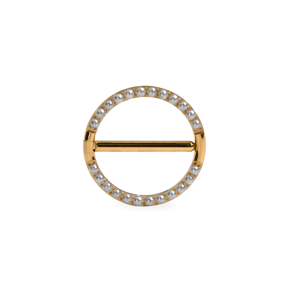 Ar pērlēm rotātais krūtsgala klikeris no titāna pierāda, ka pērles nav domātas tikai kaklarotām vien. Ar zelta vai sudraba krāsu pārklāts aplis, kuru izrotā ķepiņās iestrādātas pērles, izteiksmīgi ierāmēs Tavu pīrsingu.
