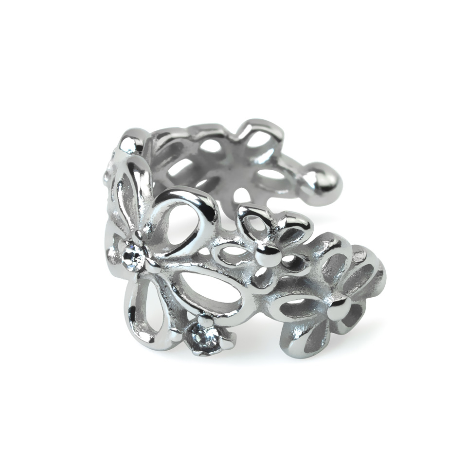 Šis smalkais auss kaffs ir izgreznots ar dažāda izmēra ziediem, kas aptver Tavas auss malu. Lielāko ziedu centrā ir mazi akmentiņi, kas piešķir šai rotai neuzkrītošu mirdzumu. Rotas galos ir nelielas bumbiņas, kas nozīmē, ka rotu ir ērti nēsāt. Tā kā rotaslieta izgatavota no ķirurģiskā tērauda, tā neapsūbēs un neiekrāsos Tavu ādu. Lielisks veids, kā papildināt savu auss rotu kombināciju bez nepieciešamības veikt papildu pīrsinga procedūru.