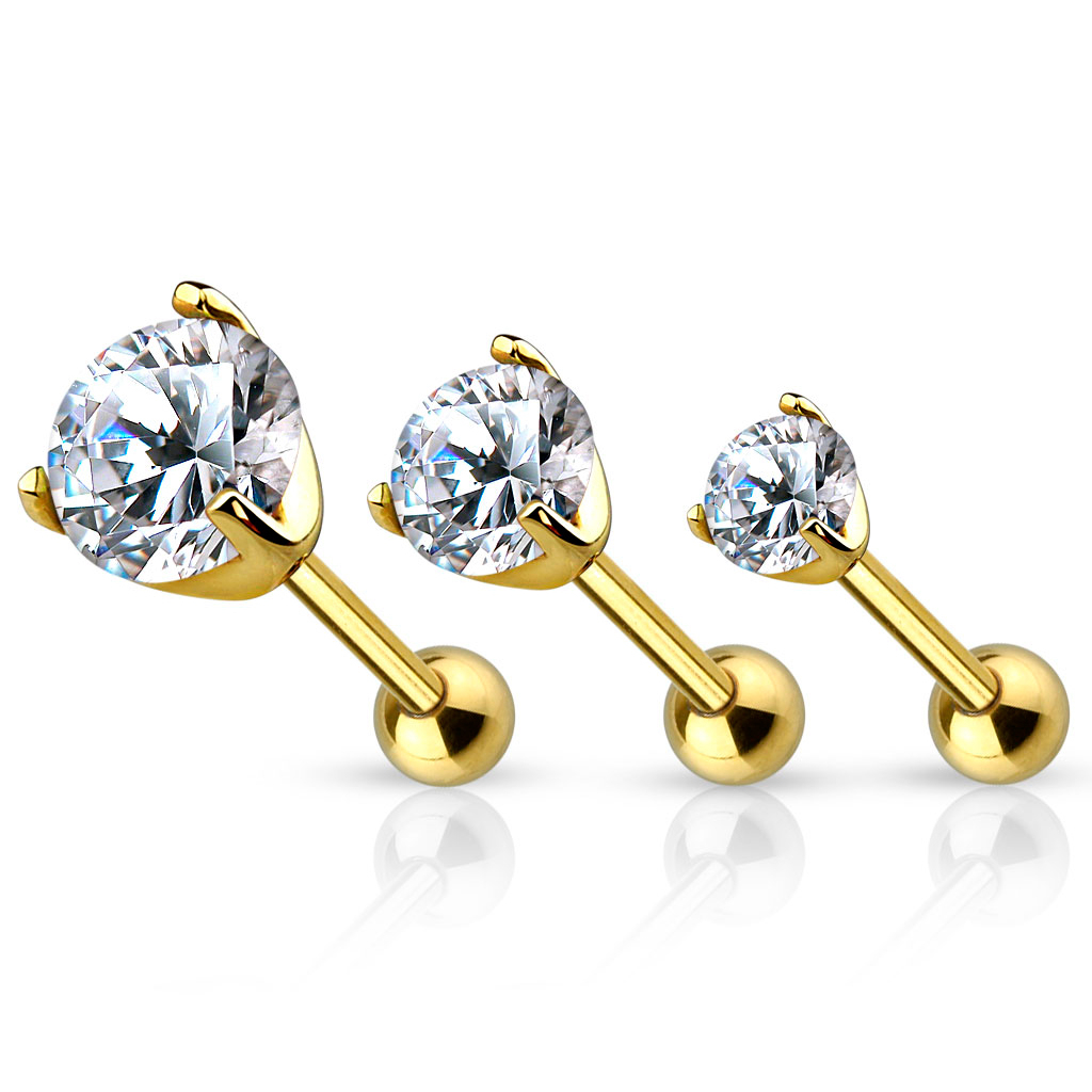 Piedāvājam Tev trīs, ekskluzīvu, no tīra zelta izgatavotu auss pīrsingu stienīšu komplektu. Šo satriecošo nagliņu stienīša biezums ir 1,2 mm (16g), tādēļ tie ideāli derēs ar adatu caurdurtiem pīrsingiem. Komplektā ietilpst trīs auskari, rotāti ar skaistu kristālu, katrs citādākā izmērā: 2 mm, 3 mm un 4 mm (1/6 collas, 1/8 collas, 5/32 collas).