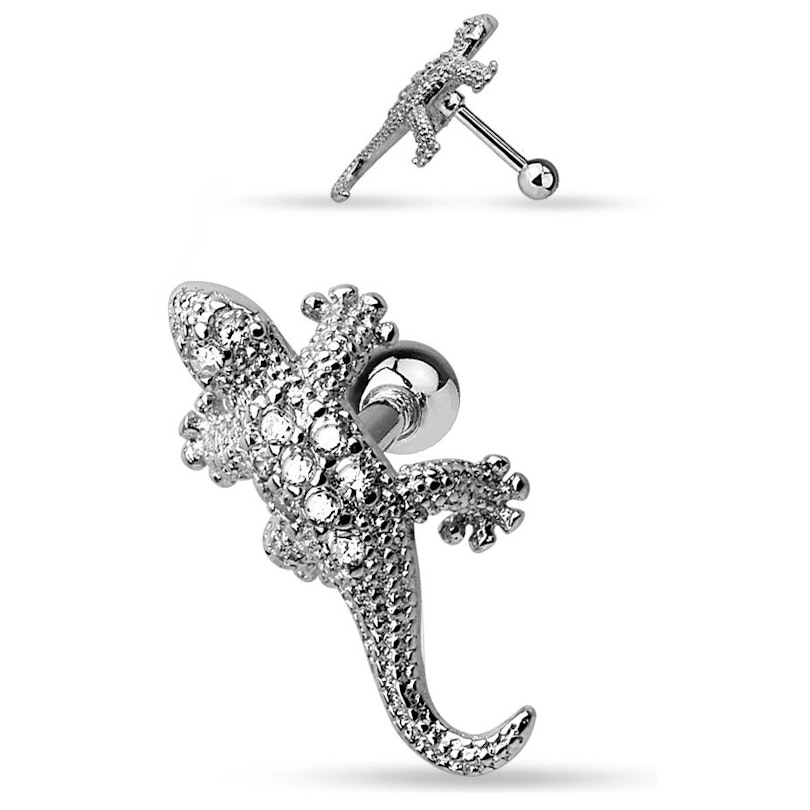 Labi labi! Tas gluži nerāpos pa Tavu ausi, bet viss pārējais par šo rotaslietu gan ir taisnība. Kad tā būs ievietota pīrsingā, ekstravagantā ķirzaciņa izskatīsies tā, it kā uz Tavas auss būtu sastingusi kustībā. Ķirzaciņa ir rotāta ar detalizētu, krokodilam raksturīgu zvīņu rakstu, kas piešķir rotaslietai 3D efektu, liekot tai izskatīties vairāk, nekā tikai vienkāršai rotai. Tu vari to nēsāt savā tragus pīrsingā; atkarībā no tās galvas un astes novietojuma izskatīties tā, it kā ķirzaciņa rāpotu iekšā vai ārā no Tavas auss. Tu vari nēsāt šo rotaslietu arī savā helix vai auss ļipiņas pīrsingā. Tu vienmēr vari nomainīt virzienu, kurā ķirzaciņa skatīsies, šķietami tā apdomā, kur doties tālāk.