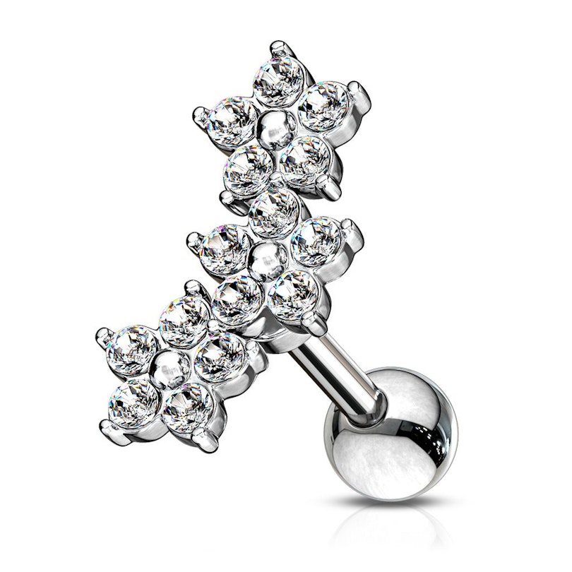 Šī pīrsinga rotaslieta ir perfekti piemērota helix, kā to var redzēt attēlā ar modeli. Trīs ziediņi priekšpusē veido nelielu loku, kas seko līdzi auss malai. Zieda kušķa izmērs ir aptuveni 1/2 collas (12 mm), no augšas līdz apakšai, kas sastāv no trīs nelieliem piecu ziedlapiņu ziediņiem. Ziedi ir pieejami trīs dažādās krāsās. Visi trīs modeļi ir vienādi, izņemot akmentiņu krāsu.