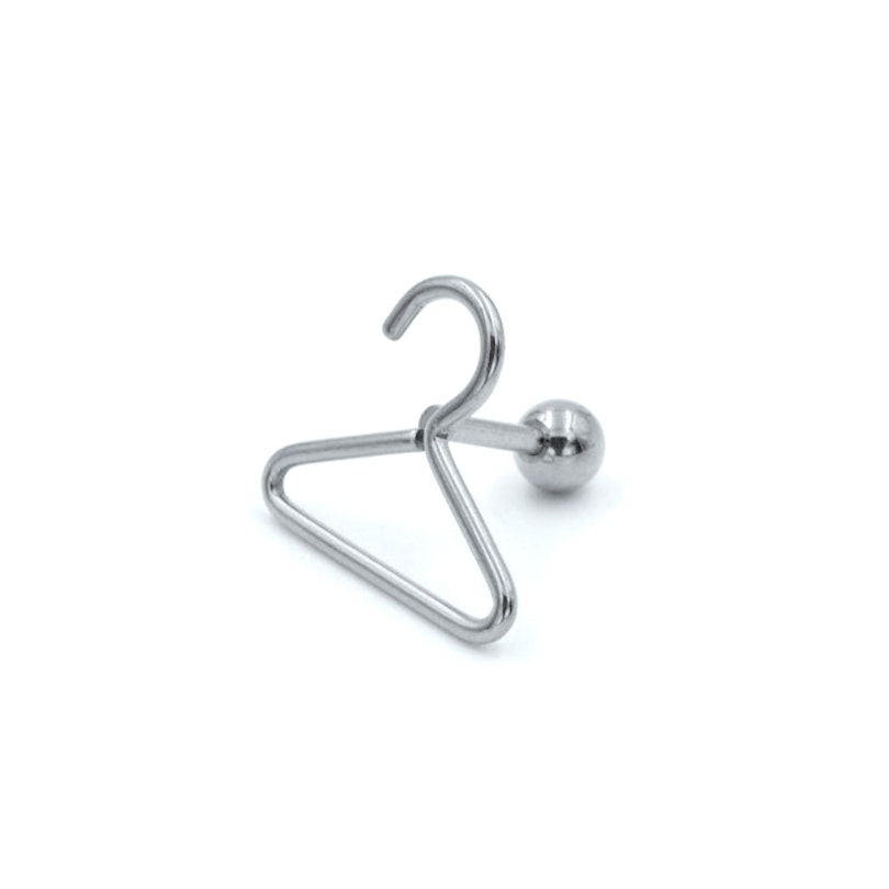 Jūs noteikti neesat redzējuši to iepriekš. Tagad jūs varat iegādāties unikālu un super oriģinālu auss pīrsingu. Šī ir metāla auss pīrsinga nagliņa ar nelielu drēbju pakaramo, kas ir 9/16 collas (15 mm) plats un 1/2 collas (13 mm) augstumā.