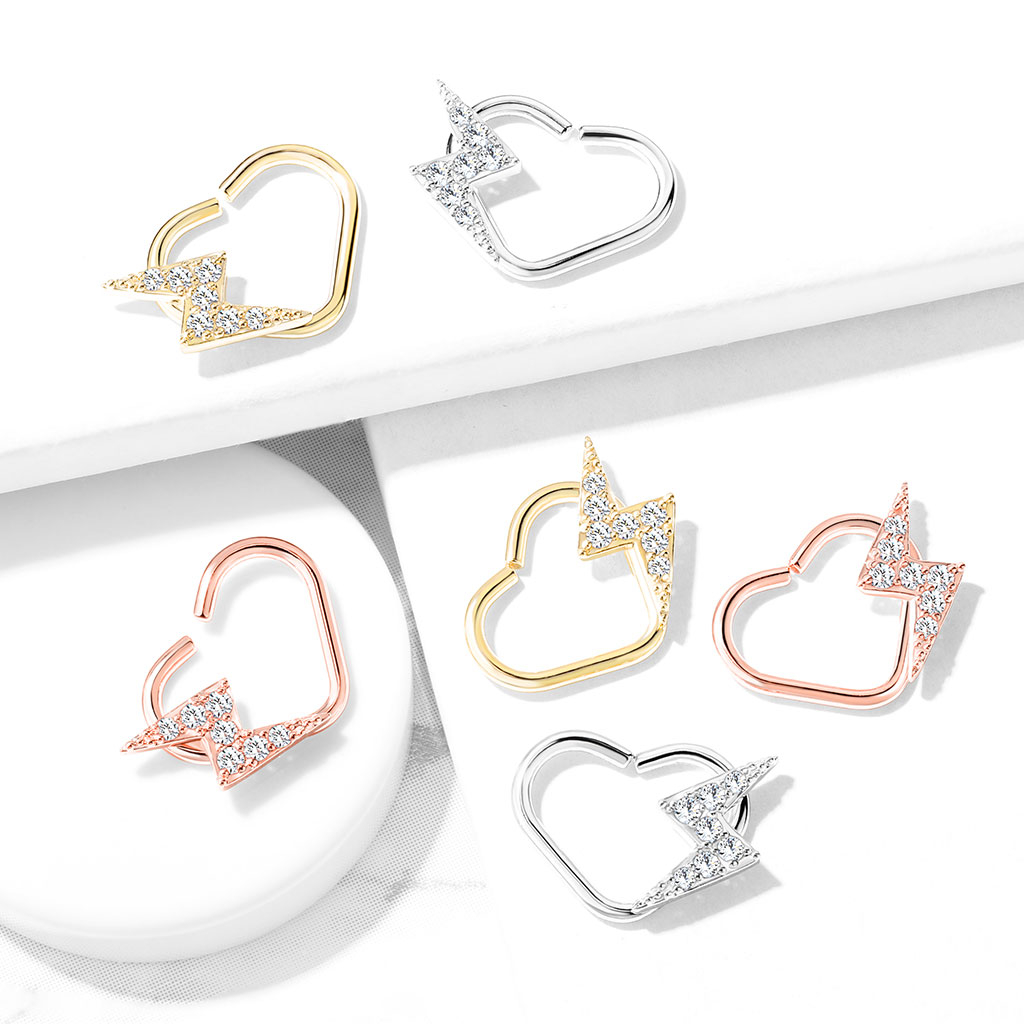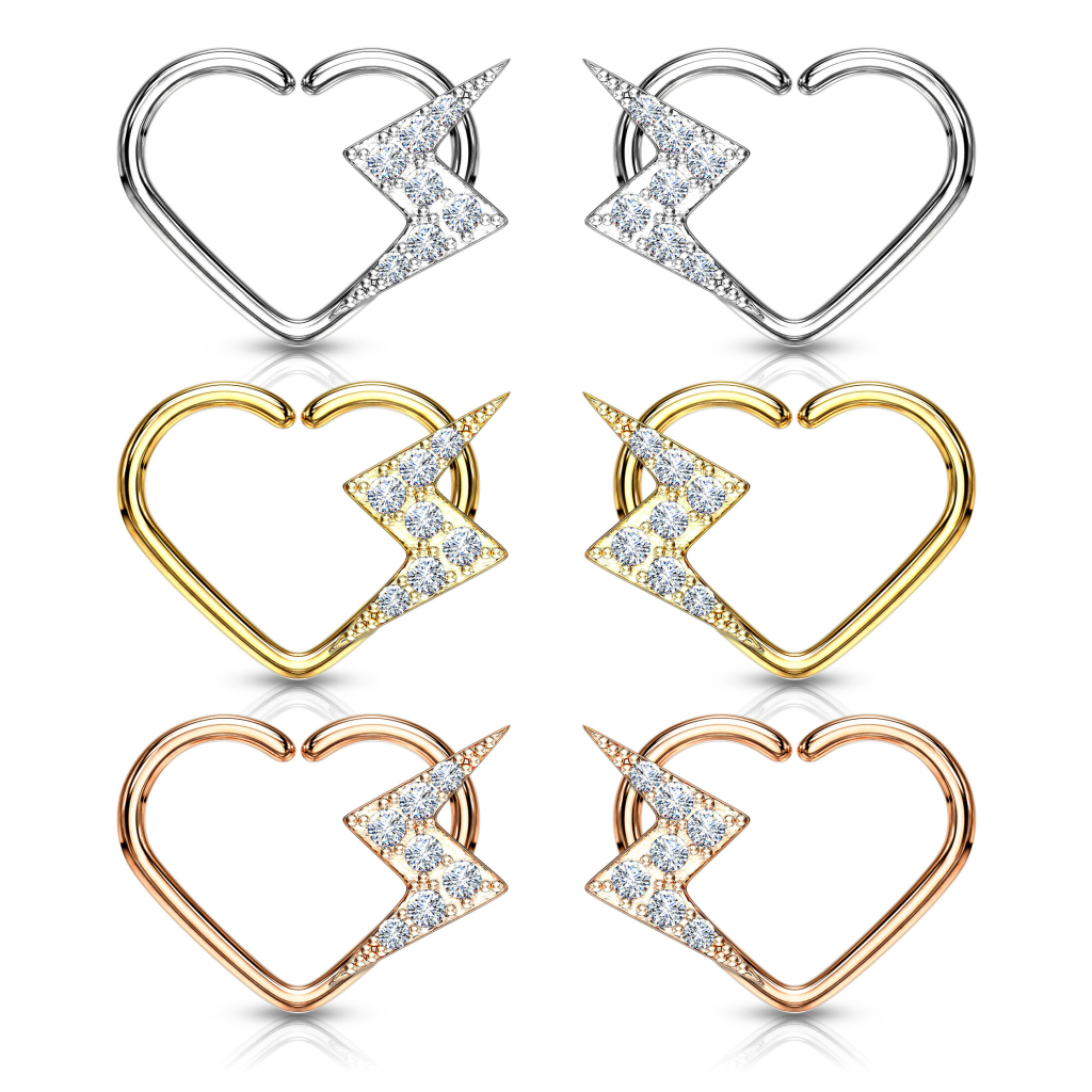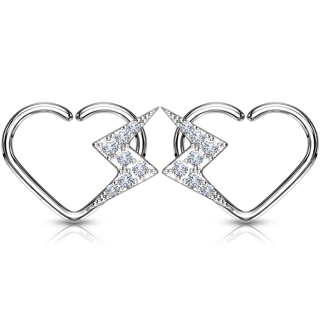 Attēlā redzamais auss pīrsings ir izveidots sirds formā; viena tā daļa iziet cauri jūsu auss pīrsingam, bet otra daļa ir dekorēta ar nelielu zibens formas rotājumu.