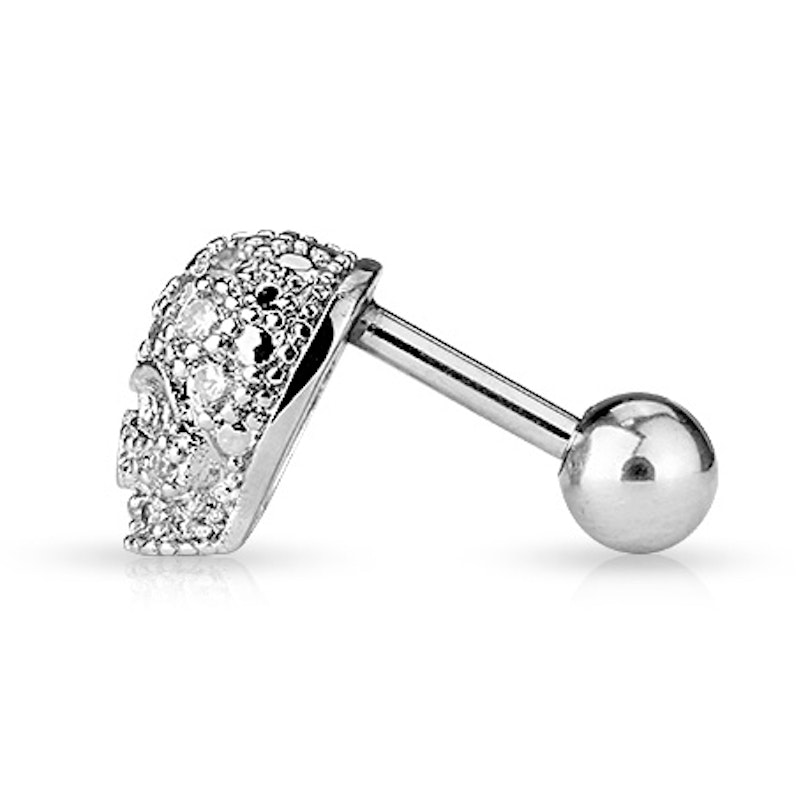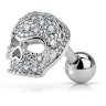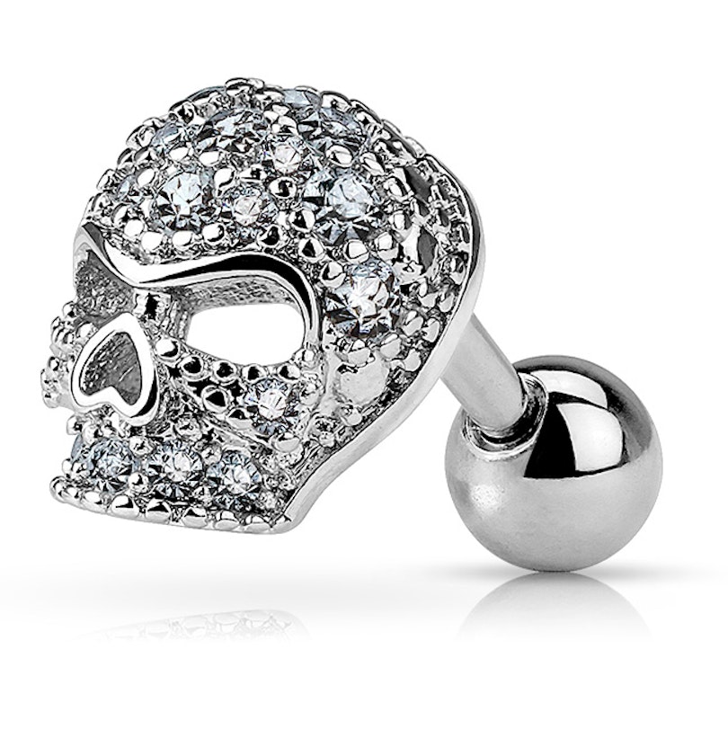 Kā tas ir redzams produkta attēlā, galvaskauss ir noklāts ar daudziem dzidriem kristāliņiem - tie atstaro gaismu dažādos virzienos. Stienītis un uzgalis ir izgatavoti no ķirurģiskā tērauda, bet galvaskausa struktūra no misiņa. Tā sarauktais skatiens, kas piešķir tam brutālu paskatu, pateiks visu, ko domā tiem, kuri uzdrošināsies teikt ko sliktu par Tavu pīrsingu.