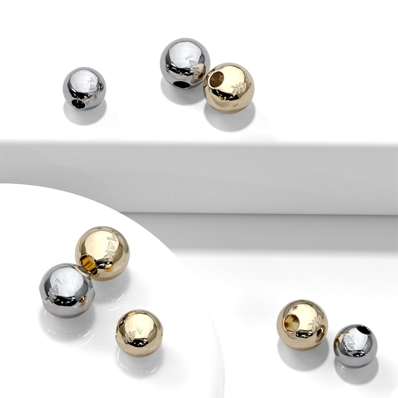 Kā jau minējām, bumbiņveida uzgalis ir izgatavots no tīra 14 karātu zelta, bet jums ir iespēja to iegādāties ne tikai dzeltenā, bet arī no baltā zelta. Tāpat ir pieejami dažādi izmēri, gan biezums, gan uzgaļa diametrs. Atkarībā no stienīša skrūves biezuma, jūs varat izvēlēties 16 g (1.2 mm) vai 14 g (1.6 mm) Bumbiņveida uzgalis ir pieejams 1/8 collu (3 mm) vai 5/32 collu (4 mm) diametrā, tādēļ ir iespēja iegādāties nelielu un diskrētu uzgali, vai arī nedaudz lielāku un uzkrītošāku.