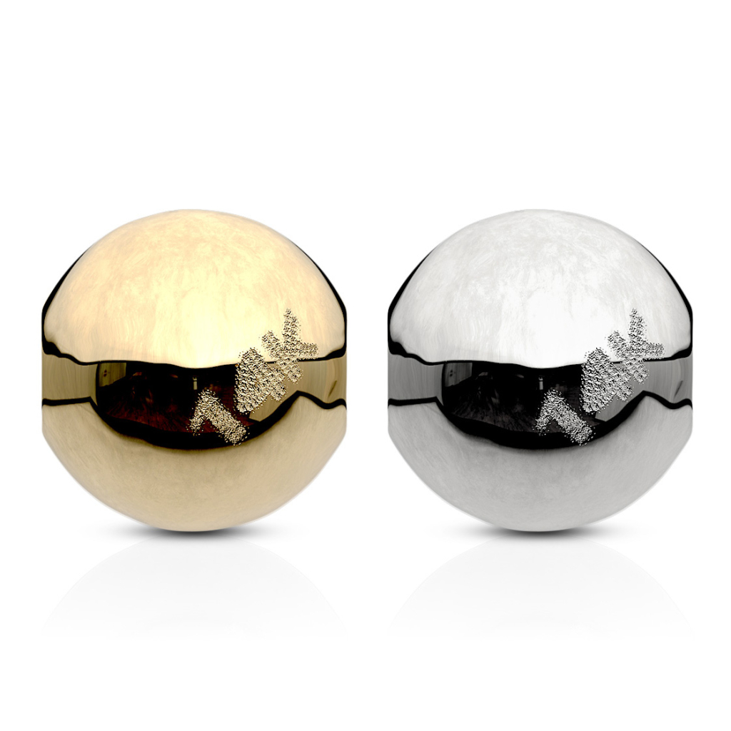 Kā jau minējām, bumbiņveida uzgalis ir izgatavots no tīra 14 karātu zelta, bet jums ir iespēja to iegādāties ne tikai dzeltenā, bet arī no baltā zelta. Tāpat ir pieejami dažādi izmēri, gan biezums, gan uzgaļa diametrs. Atkarībā no stienīša skrūves biezuma, jūs varat izvēlēties 16 g (1.2 mm) vai 14 g (1.6 mm) Bumbiņveida uzgalis ir pieejams 1/8 collu (3 mm) vai 5/32 collu (4 mm) diametrā, tādēļ ir iespēja iegādāties nelielu un diskrētu uzgali, vai arī nedaudz lielāku un uzkrītošāku.