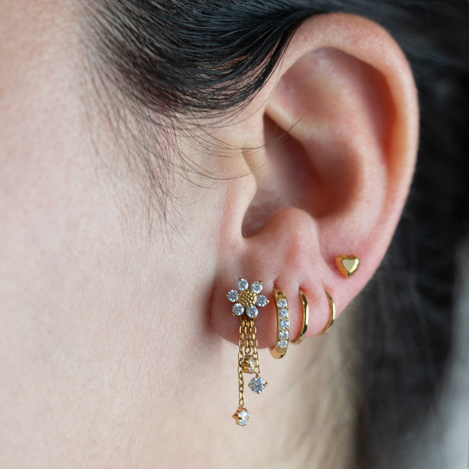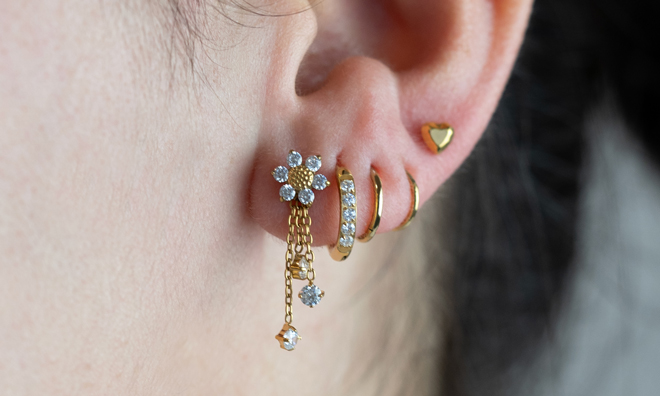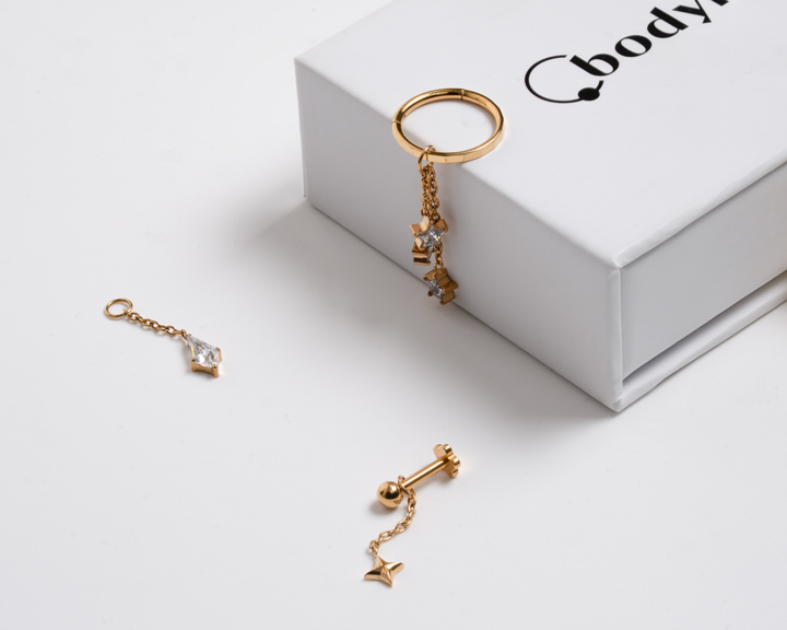 Kombinē piekariņus ar pīrsingu gredzeniem, huggie gredzeniem, pat labretēm un nabas rotām, lai radītu unikālu stilu.