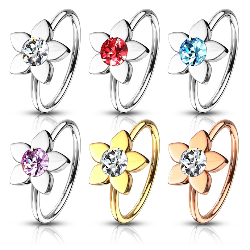 Ja meklējat pīrsinga gredzenu ar spēcīgu simbolisku nozīmi, jūs esat pareizajā vietā. Rota, uz kuras esat uzklikšķinājuši, ir viengabala deguna pīrsinga gredzens, kas priekšpusē ir dekorēts ar lotosa zieda kulonu. Zieda centrā atrodas apaļš akmens, kura krāsu jūs varat izvēlēties. Piemēram, jūs to varat iegādāties rozā vai sarkanā krāsā. Turklāt jums ir iespēja izvēlēties paša pīrsinga gredzena krāsu - piemēram, modeli dzeltenā vai baltā zelta krāsā. Tādā veidā jūs varat personalizēt šo rotu pēc savas gaumes. Tomēr ņemiet vērā, ka gan sarkanā zelta, gan dzeltenā zelta versijas, ir pieejamas tikai ar kristāldzidru akmeni.