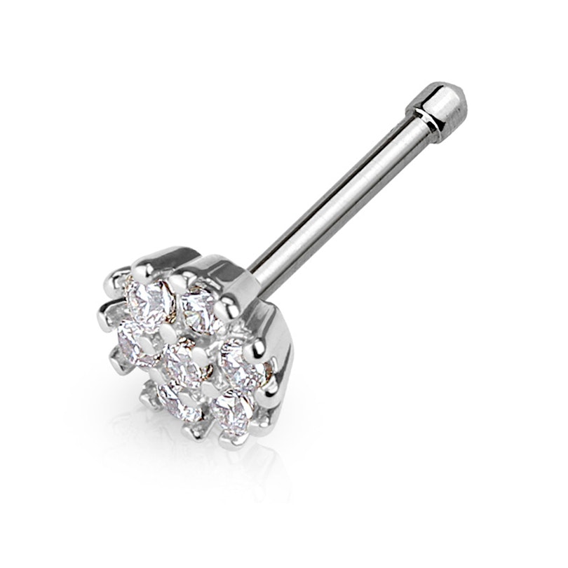 Šī deguna nagliņa ir jums lieliski piemērota, ja jūs vēlaties ko patiesi sievišķīgu un oriģinālu. Šī deguna nagliņa ir nedaudz lielāka, kā citas. Tās aptuvenais diametrs ir 1/4 collas (6 mm) ar dzidriem akmentiņiem pārklātām ziedlapiņām un sirdi. Nagliņas struktūras dizains nodrošinās, ka akmentiņi neizskrīt ārā, tādēļ, jūr varēsiet nēsāt šo sievišķīgo rotu vēl ilgi, jo ilgi.