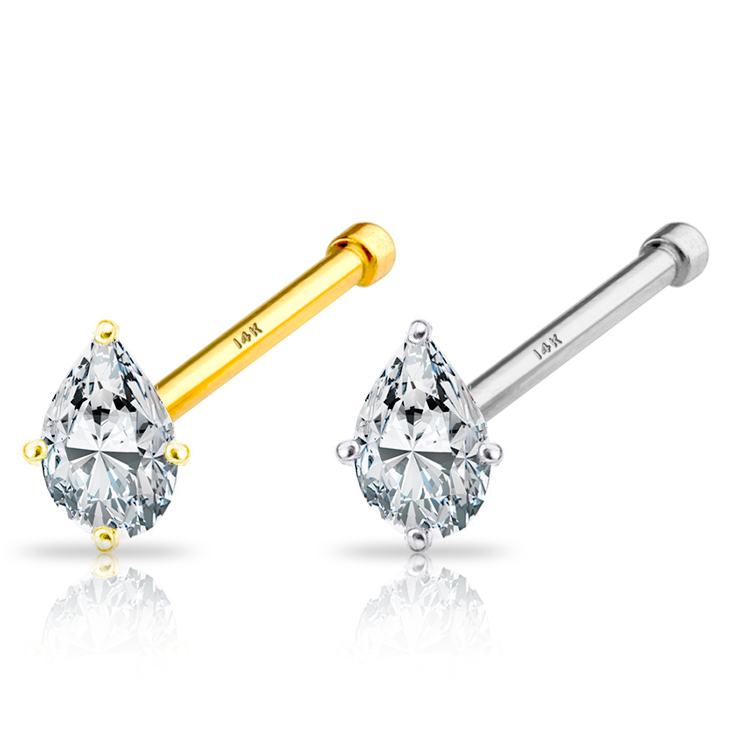 Šis smalkā un brīnišķīgā deguna nagliņa ir izgatavota no 14 karātu zelta. Stienīša garums ir 1/4 collas (6 mm) un tam galā ir kristāliņš. Kristāliņš ir lāses jeb asaras formā, iestatīts aiz četrām mazām dakšiņām. Stienīša otrā galā ir neliela bumbiņa, kas notur nagliņu vietā. Tas ir pietiekami maziņš, lai to varētu izstumt cauri pīrsingam, bet pietiekami liels, lai nodrošinātu, ka tas neizslīdēs ārā.