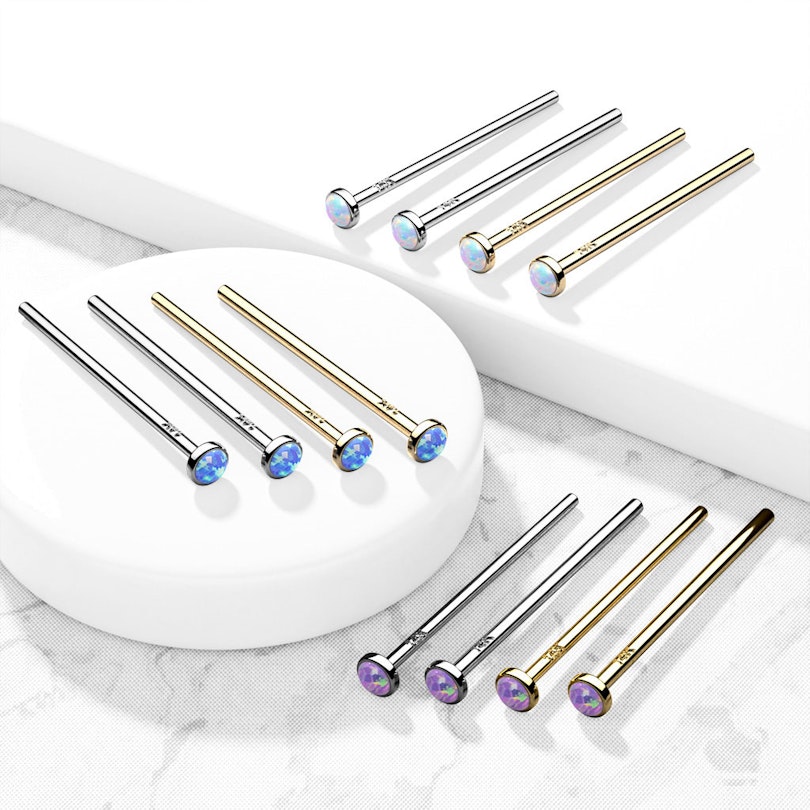Nagliņas ir lieliskas deguna pīrsinga rotaslietas tiem, kuri vēlas pielāgot rotu savam pīrsingam. Šī deguna nagliņa jeb fishtail ir izgatavota no 14 karātu zelta un, lai pielāgotu to jūsu unikālajai nāss formai, jūs varat to pēc nepieciešamības nolocīt, izmantojot piemērotas knaibles. Stienītis ir 19 mm garš, un tas ir pieejams divos dažādos biezumos. Papildus tam, jums ir iespēja izvēlēties starp dažādām opalīta krāsām. Tā kā īstie opāli ir pārāk trausli, lai tos izmantotu rotaslietu izgatavošanā, to vietā nagliņu dekorē opalīts. Jūs varat izvēlēties arī pašas rotas struktūru, starp tradicionālo dzelteno zeltu un spīdīgo balto zeltu.
