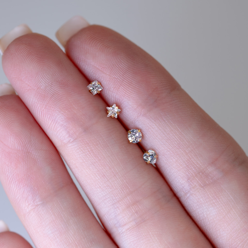 Nagliņai ir L-forma, kas nodrošinās, ka tā turēties vietā. Stienīša izmērs ir vienāds visiem modeļiem: tas ir 0.8 mm (20g) biezumā un 6 mm (1/4 collas) garumā. Cirkonija kristālu izmērs ir aptuveni starp 2.5 un 3 mm (1/8 collas), atkarībā no dizaina. Vērts pieminēt, ka visi modeļi ir izgatavoti no ķirurģiskā tērauda.
