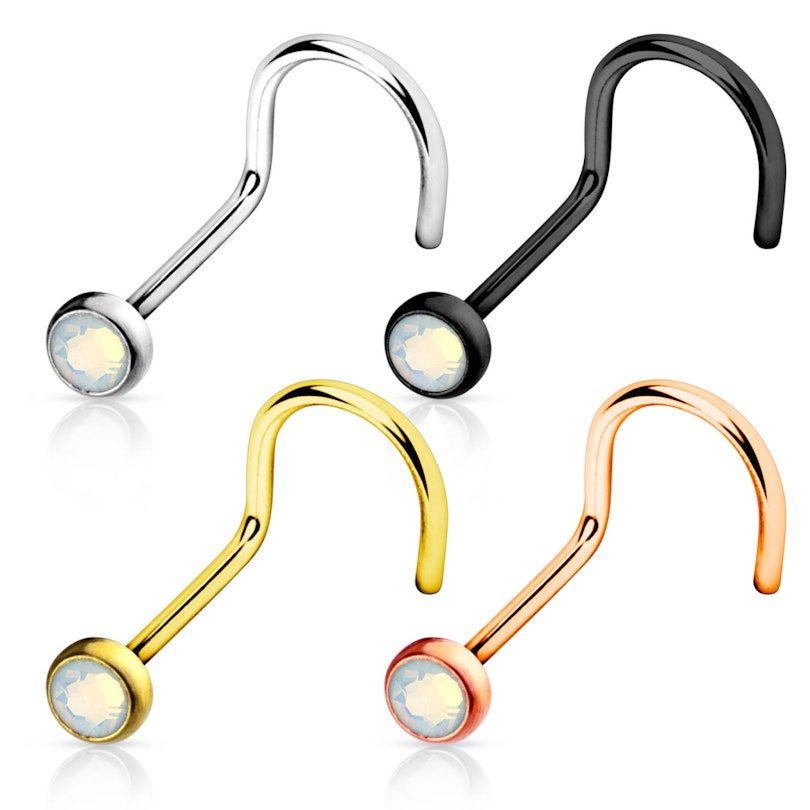Atklājiet šo piemīlīgo deguna skrūvi ar fantastisku opalīta akmeni tā galā. Tā ir izcila alternatīva regulārajai deguna nagliņai, jo tā deguna pīrsingam ir lieliski piemērota, tā kā tajā nav daļu, kuras varētu savainot jūsu nāsis. Šo skrūvi būtu jāievieto uzmanīgi, bet līdz ko tā būs ievietota, ir gandrīz neiespējami ka tā varētu izkrist.