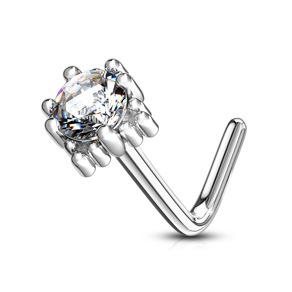 Šis deguna pīrsings ir izgatvots no īsta 14 karātu zelta un tā galā ir visskaistākais kristāls. Kristāls ir uzsēdināts uz kvadrāta formas un to cieši vietā notur prong-setting stiprinājums, kas nodrošina, ka kristāls nenonāks nost.