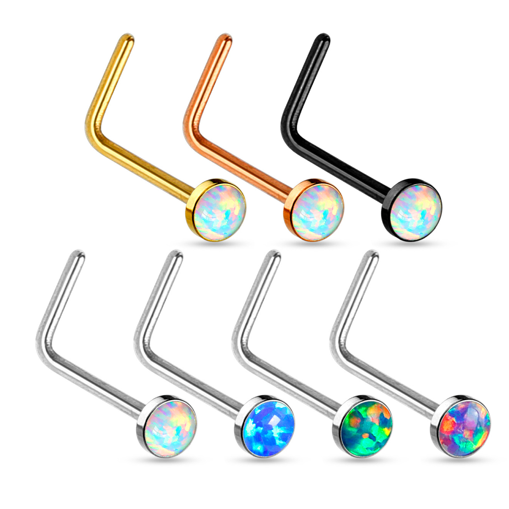 Izvēlieties sev tīkamāko, šīs deguna nagliņas krāsu starp sudrabu, zeltu, sarkano zeltu vai melnu. Visus modeļus stienīša galā dekorē skaists sintētiskais opāls, kas padara tos par greznām, brīnišķīgām un izsmalcinātām rotām. Visām nagliņa krāsām, ir pieskaņots baltas krāsas opāla akmens, bet sudraba modelim ir pieejamas papildus opāla krāsu izvēles: zils, zaļš un lillā. Izvēlieties to, kas vislabāk atbilst jūsu gaumei un stilam. Kad šī nagliņa atradīsies jūsu deguna pīrsingā, stienīti nebūs iespējams redzēt, bet tikai tā dekorāciju ar opāla akmentiņu. Stienītim ir L forma, ieliekts tā centrā, taisnā 90 grādu leņķi, kuru ir viegli ievietot un izņemt.