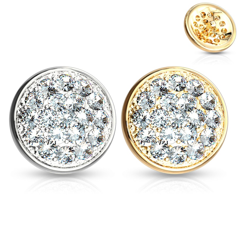 Akmeņi, akmeņi un vēlreiz akmeņi: kā redzams attēlā, šī rotaslieta ir izgreznota ar akmentiņu kaudzi. Nav tā, ka mēs esam iemīlējušies Miss Cirkonijā, bet šajā rotaslietā ir inkrustēti veseli 19! Ja nevēlaties tik daudz akmentiņus savā rotaslietā, tad jums ir akmentiņu problēma. Lai gan varētu likties nedaudz pārmērīgi, inkrustēt 19 kristāliņus nelielā dermal uzgalī, kura lielums nepārsniedz 1/4 collas (6 mm), tas liek rotai izskatīties satriecoši, nepadarot to pārlieku smagu.