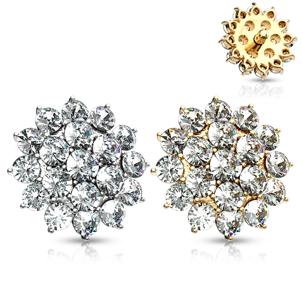 Šeit jūs atradīsiet oriģinālu rotaslietu, kas skaisti izgreznos jūsu dermal anchor. Uzgalim ir zieda dizains, kas ir pārklāts ar pāris kristāldzidriem akmentiņiem. Tie piešķir rotai augstākās klases mirdzumu. Akmentiņi ir noturēti vietā, pateicoties dakšiņu iestatījumam, kas notur katru no tiem.