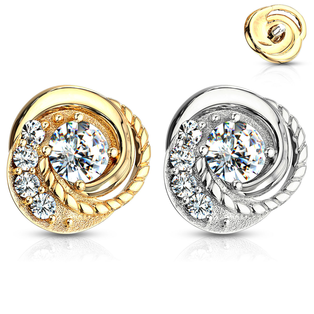 Nosaukums: Dermal uzgalis no 14 karātu zelta ar pinumu motīvu un centrālo kristālu