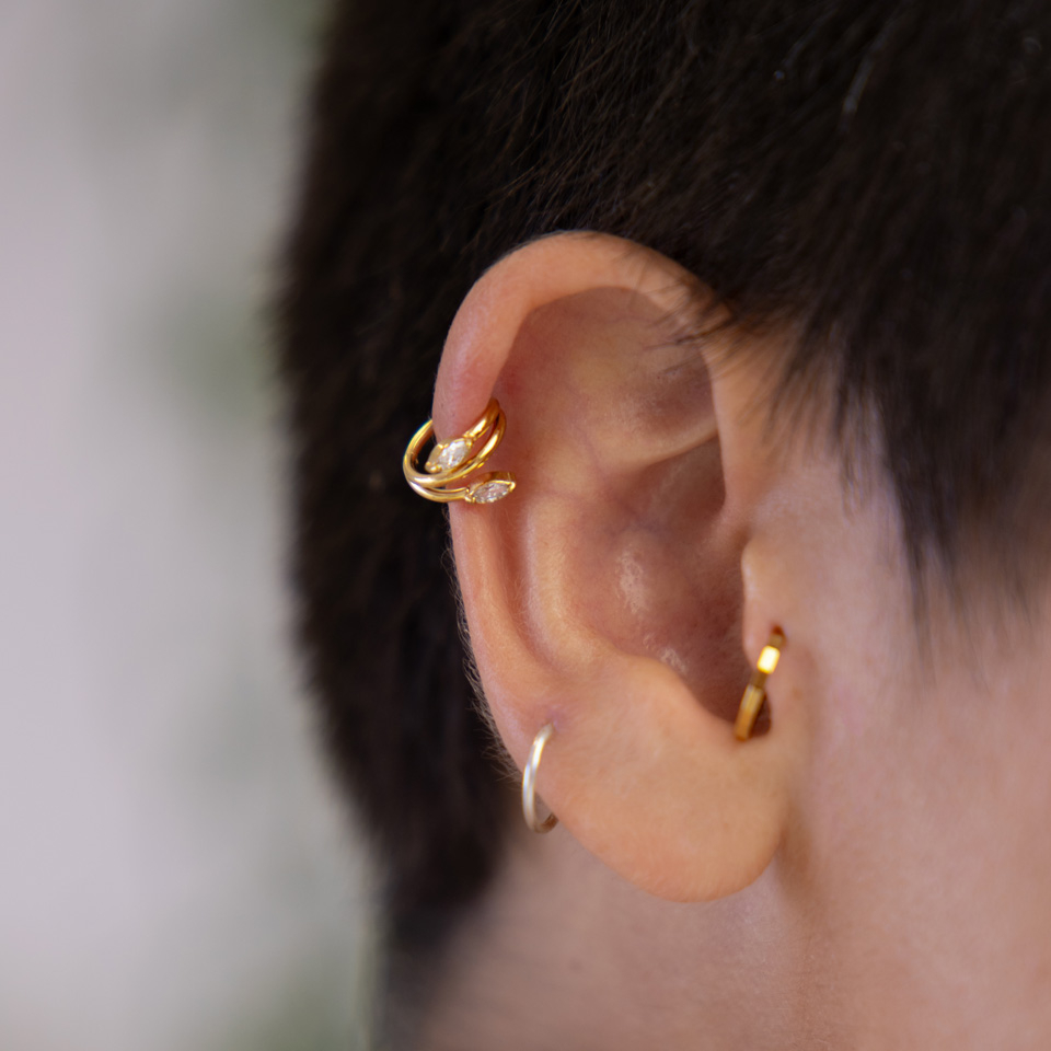 Smalks ķirurģiskā tērauda pīrsingu gredzens ar eņģīti. Šis skaistais pīrsingu gredzens ir rotāts ar diviem marķīzes slīpējuma cirkonija akmentiņiem, kas atgādina vīnogulāju lapas. Šī daudzveidīgā rota pieejama ar diametru 8 mm un 10 mm, kā arī ar zelta vai sudraba krāsas pārklājumu, un tā izskatīsies brīnišķīgi dažādos auss pīrsingos, it sevišķi tādos skrimšļa pīrsingos kā rook un helix.