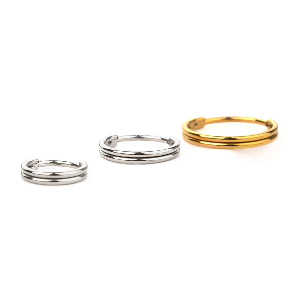 Šis segmentētais pīrsingu gredzens izskatās tā, it kā pīrsingā būtu ievietoti divi gredzeni, taču patiesībā Tavā pīrsingā ievietots tikai viens.