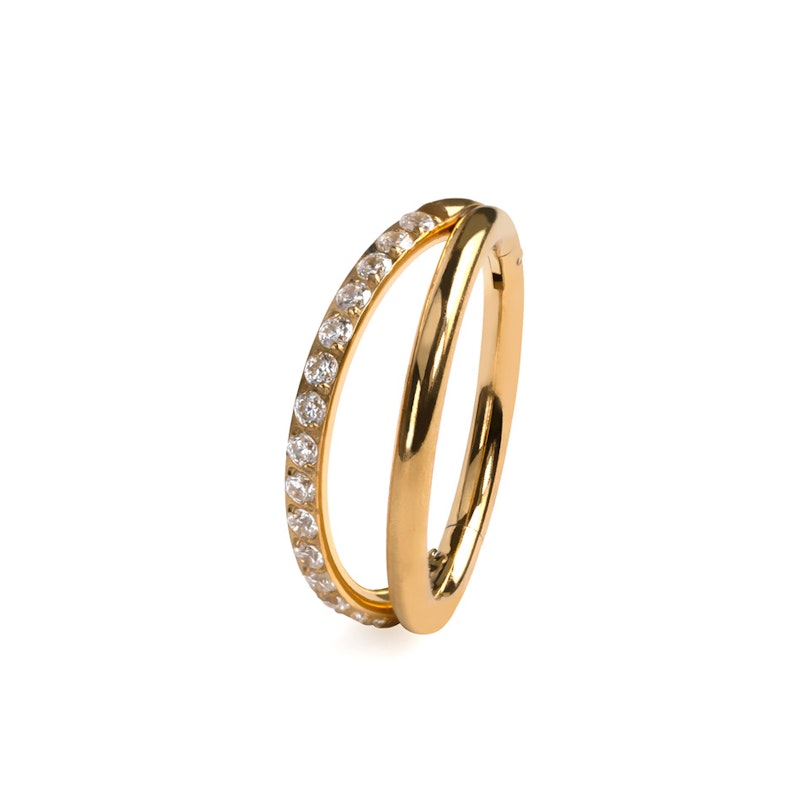 Šis divkāršais titāna pīrsingu gredzens ar akmentiņiem uz viena loka, kas ietilpst Bodymod trend kolekcijā, ienes svaigas vēsmas ar atšķirīgo dizainu: viena puse ir gluda un minimālistiska, turpretī otru klāj akmentiņi. Divi noskaņojumi - viens pīrsingu gredzens.