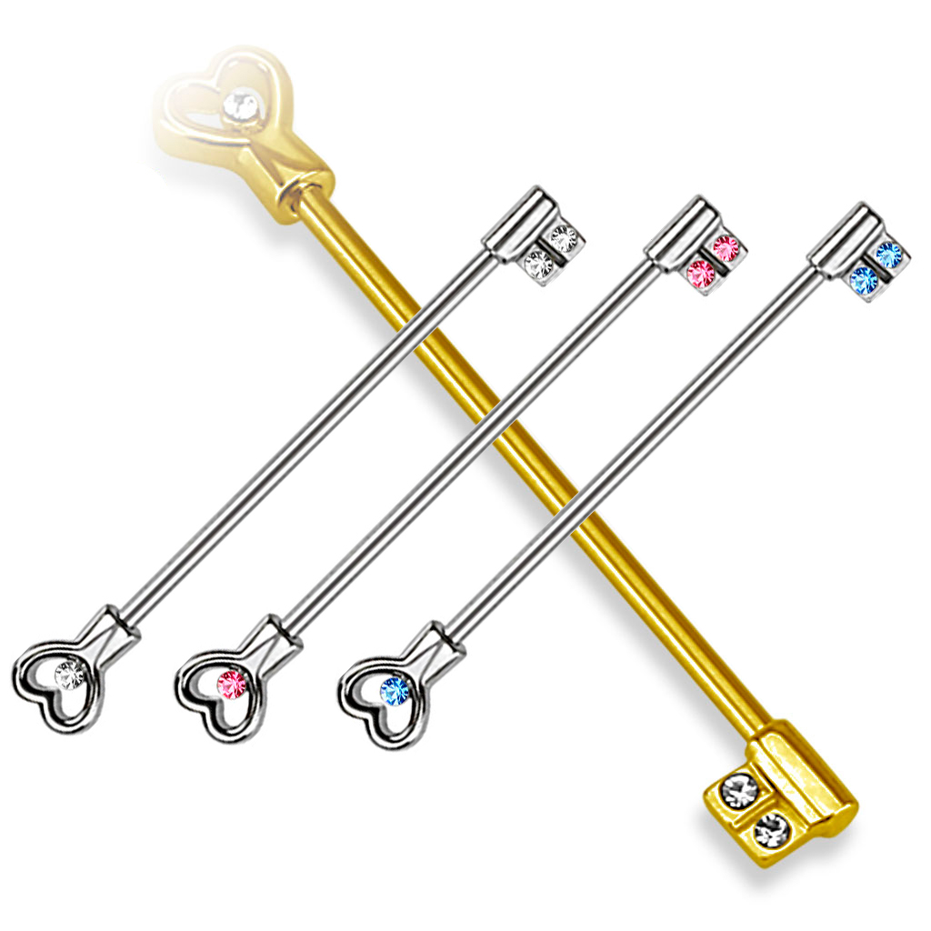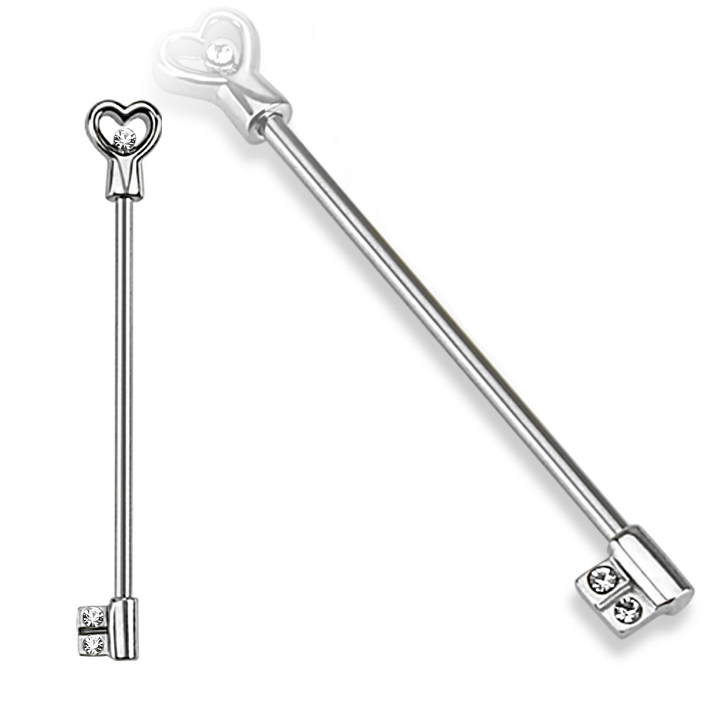 Slaids, neizsakāms un elegants, šis industriālais stienītis ir ideāls jūsu ausīm. Tam ir jauks un sievišķīgs dizains: atslēdziņa ar sirds formas uzgali. Atslēgas zobiņus rotā divi, smalki kristāliņi, un viens rotā sirds formas uzgali.