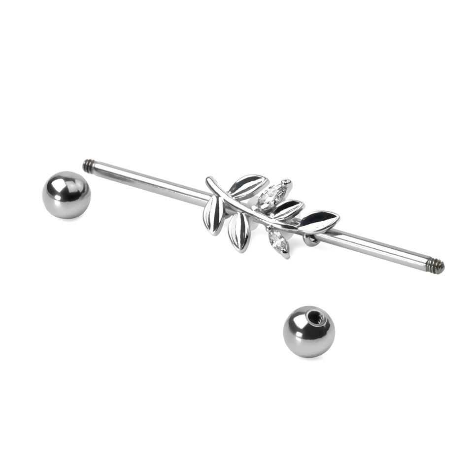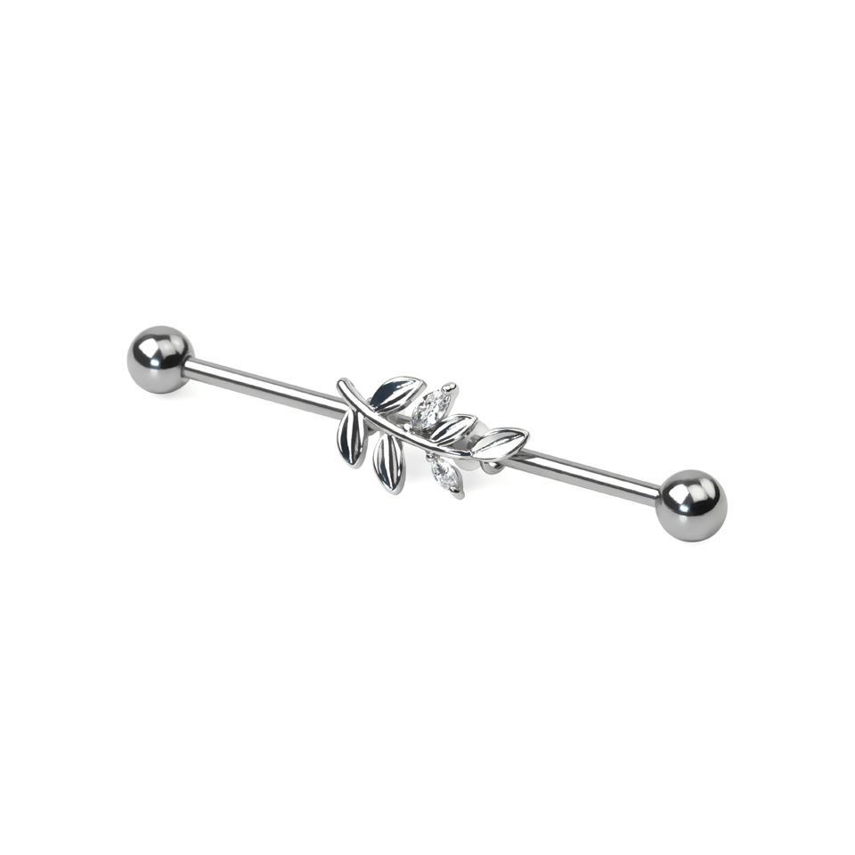 Rotaslietās ziedi, un lapas vienmēr ir gājušas roku rokā, un šis industriālais stienītis nav izņēmums. Stieņa vidū atrodas zariņš ar lapām, kuru var pārvietot uz augšu un leju. Divas lapiņas ir aizstātas ar kristāldzidriem akmentiņiem, kas skaisti papildina rotaslietu. Zaru var nofiksēt, kur vēlaties, ar divu, komplektā esošo O-riņķu palīdzību