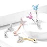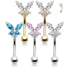 Šī rotaslieta ir izrotāta ar mazu, jauku tauriņu tās virsotnē. Tauriņa formu veido divi mazi, apaļi kristāli apakšpusē un divi lielāki, ovāli kristāli augšpusē, tiem kopā atveidojot spārnus. Jums ir iespēja izvēlēties krāsu šiem kristāliem - aplūkojiet izvēlni, lai aplūkotu visas iespējamās izvēles iespējas. Šos kristālus vietā notur iestatīšana, kas nozīmē, ka nav nepieciešamības izmanotot līmi, tācu mēs iesakām neļaut šai rotaslietai nonākt tiešā saskarsmē ar ūdeni.