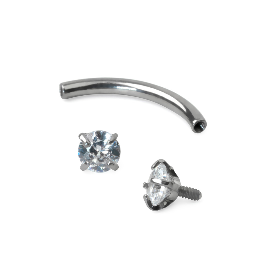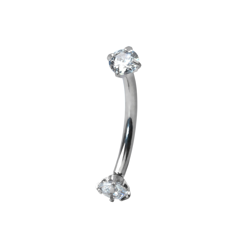 Izliektais stienītis ir izgatavots no titāna, kas ir viens no labākajiem materiāliem, kādu izmanto pīrsingu rotaslietu izgatavošanai. Stienītim ir iekšējās vītnes, kas rotas ievietošanu pīrsingā padara vieglāku un saudzīgāku pret ādu. Rotai ir divi nelieli 3 mm (1/8) kristāla uzgaļi. Tu vari izvēlēties starp dažādām krāsu kombinācijām, tomēr ņem vērā, ka sudraba modelim kristāla krāsu izvēle ir plašāka.