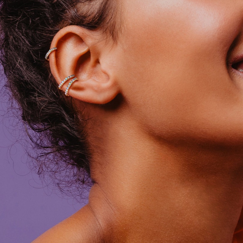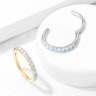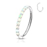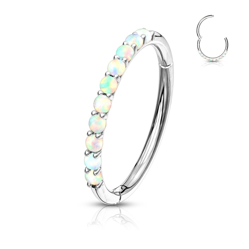 Pīrsinga gredzens ir piemērots gan auss, gan deguna pīrsingiem. Tas varētu nebūt labākais septum, jo opāli būs vērsti uz leju. Akmeņi nav īsts opāls, jo tie ir pārāk trausli, lai tos lietotu rotaslietās. Šie ir izturīgi sintētiskie opāli, kuri ir tikpat skaisti kā īstie - tikai eksperti varētu noteikt atšķirību.