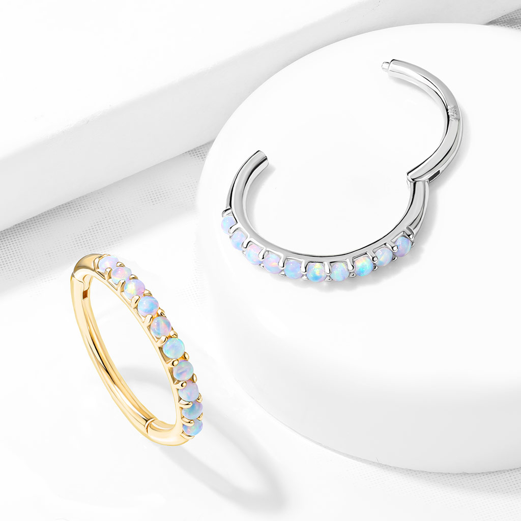 Pīrsinga gredzens ir piemērots gan auss, gan deguna pīrsingiem. Tas varētu nebūt labākais septum, jo opāli būs vērsti uz leju. Akmeņi nav īsts opāls, jo tie ir pārāk trausli, lai tos lietotu rotaslietās. Šie ir izturīgi sintētiskie opāli, kuri ir tikpat skaisti kā īstie - tikai eksperti varētu noteikt atšķirību.