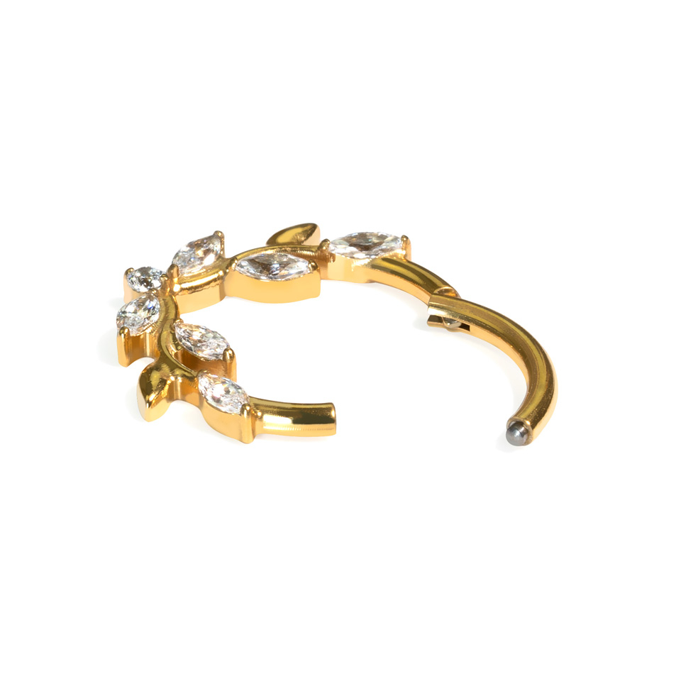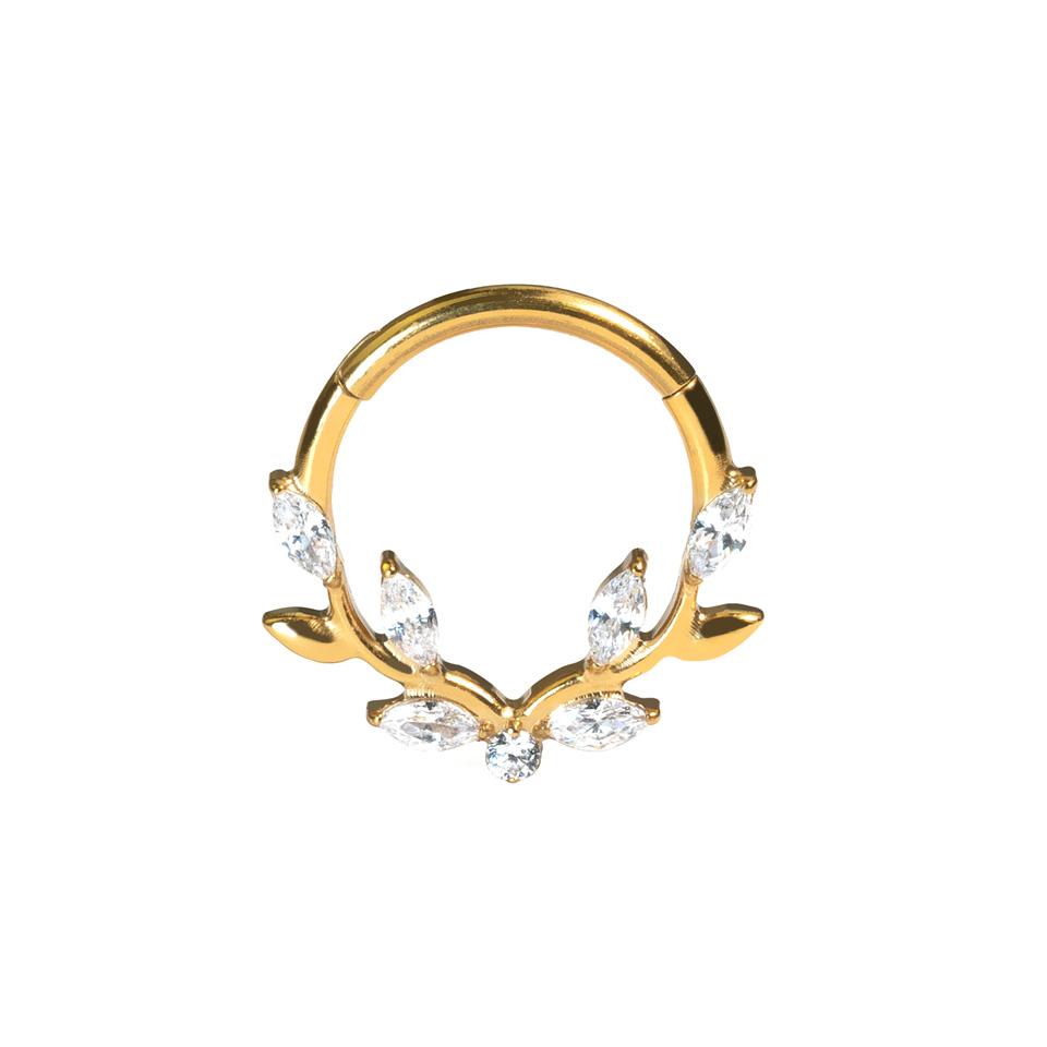 Šis premium uz priekšu vērstais klikeris ar skaisto vīnogulāju dizainu izskatīsies lieliski tādos pīrsingos kā daith un septum. Tā kā tas izgatavots no titāna, tas ir izturīgs un hipoalerģisks. Lielisks papildinājums Tavai rotu kolekcijai.