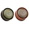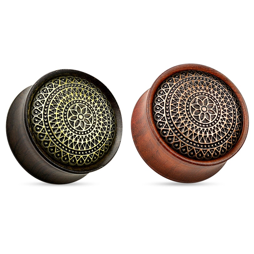 Tādi organiski materiāli kā koks, ļauj pīrsinga ādai elpot par ar rotaslietām, tādejādi novēršot nepatīkamas smakas. Šis plugs ir pieejams no divu veidu kokiem. Izvēlieties starp palisandra jeb rožkoka sarkanīgo krāsu, vai arī tumšo melnkoka krāsu. Pluga priekšpuse ir izgatavota no misiņa: palisandra koka modelī, misiņam ir vara krāsa, melnkokam ir misiņa krāsa. Abi modeļi ir kontrastā ar koka dabīgo krāsu. Zeltainais raksts pāri tumšajam plugam, piesķirt rotaslietai antīku izskatu, bet sarkanīgais koks harmonizē ar misiņa motīvu. Kā minēts iepriekš, šis ir organisks materiāls, kas nozīmē ka koka struktūra var atšķirties no modeļa uz modeli. Tomēr, ja jūs pirksiet divus modeļus, mēs centīsimies piemeklēt divus līdzīgus. cik vien tas ir iespējams.