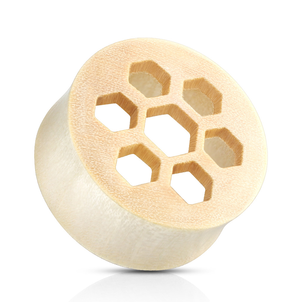 Plugs ir izdekorēts ar izgrebtu seškantes dizainu - tas varētu atgādināt bišu šūnas!