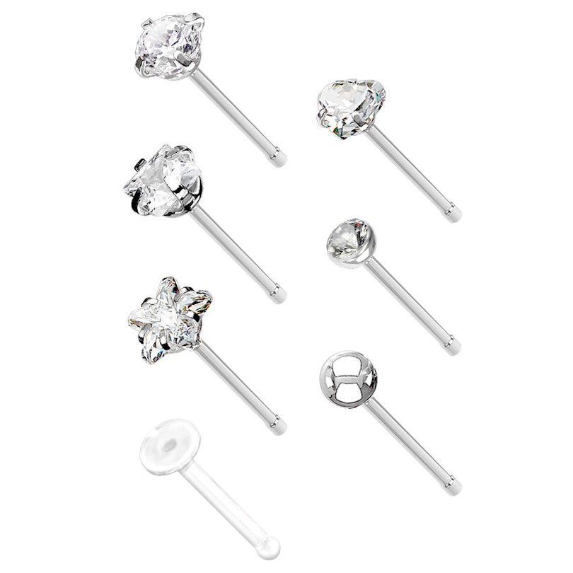 Ar šo komplektu, jūrs varēsiet mainīt deguna pīrsingus, cik bieži jūs to vēlēsieties. Ja jūs vēlaties mainīt to katru dienu, šis komplekts ir domāts tieši jums. Visas nagliņas ir izgatavotas no ķirurģiskā tērauda, izņemot reteineri. Visas ir satndarta izmēros: izmērs 20 (0.8 mm) un to garums ir 1/4 collas (6 mm).