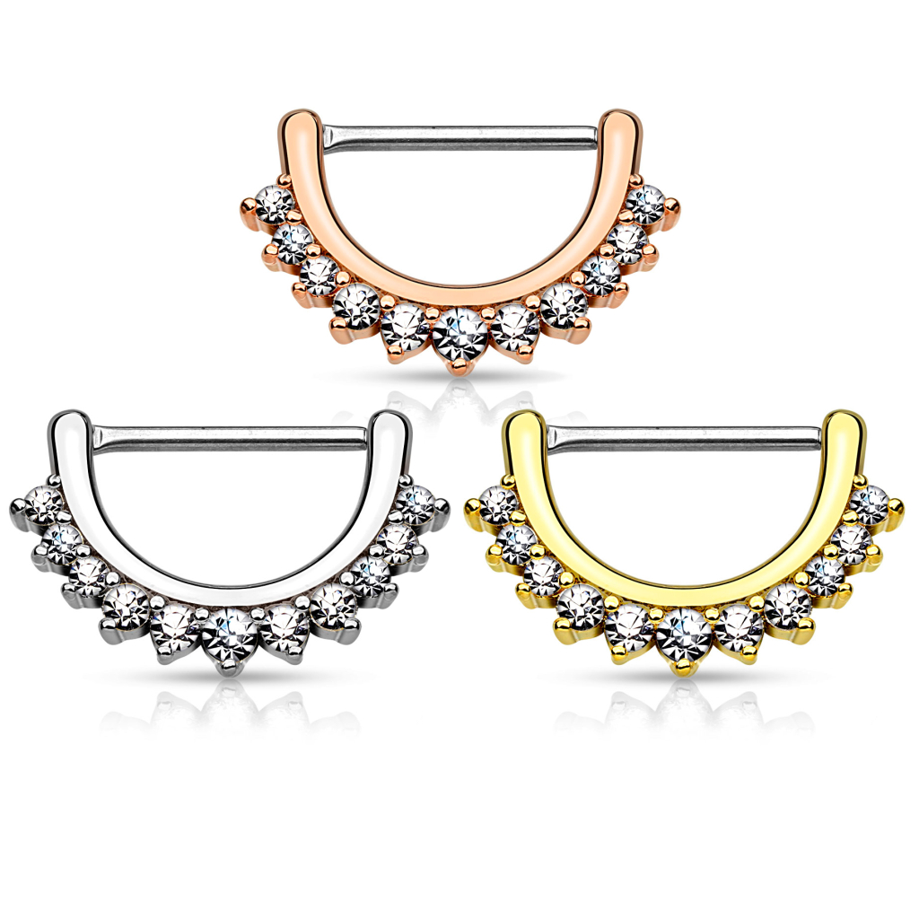 Izņemt krāsas, klikeriem ir identiski dizaini, tādēļ jums ir jaizvēlas tikai krāsa. Visi trīs modeļi ir vienlīdzīgi sievišķīgi, un visiem modeļiem akmentiņi ir baltā krāsā. Izgreznotajā lokā, rindiņā ir ieklāti balti akmentiņi, no enģītes gala līdz otrai. Atrodoties pīrsingā, loks ieskaus jūsu krūtsgalu no lejasdaļas kā pusmēness. Kā jau minēts iepriekšs, šis krūtsgala klikeris ir pieejams trīs dažādās krāsās: klasiskā sudraba, zeltainā, vai arī modernā sarkanā zelta. Neatkarīgi no izvēlētā modeļa, jūs nenožēlosiet, ka iegādājāties šo skaisto rotaslietu, ar 11 kristāliņiem, kuri zem jūsu krūstsgala izskatīsies satriecoši, un atgādinās pusmēnesi.