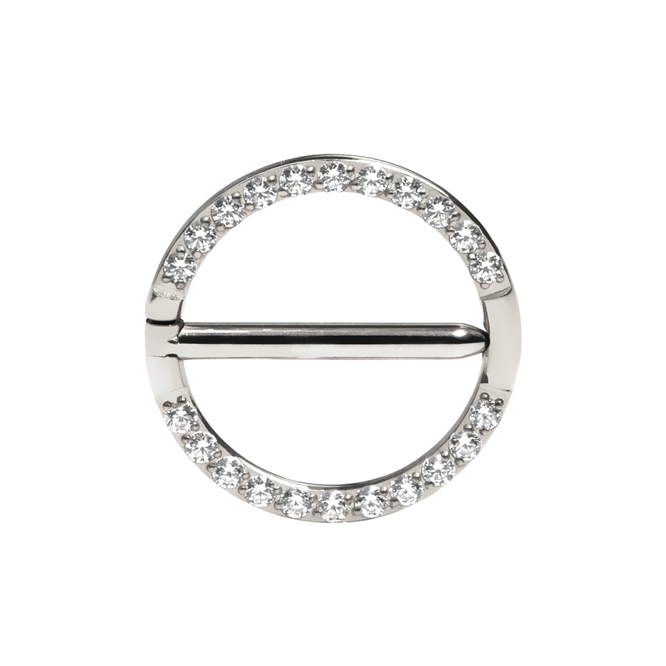 Šo apburošo riņķa formas krūtsgala klikeri no titāna rotā cirkonija akmentiņi, kas izkārtoti pavē tehnikā un skaisti ierāmē Tavu krūtsgalu. Rotaslieta ir izgatavota no titāna, tādēļ tā ir hipoalerģiska un ļoti ērta nēsāšanai. Rotaslietai pieejami divi garumi: 12 mm un 14 mm, kā arī iespēja izvēlēties zelta vai sudraba krāsas pārklājumu.