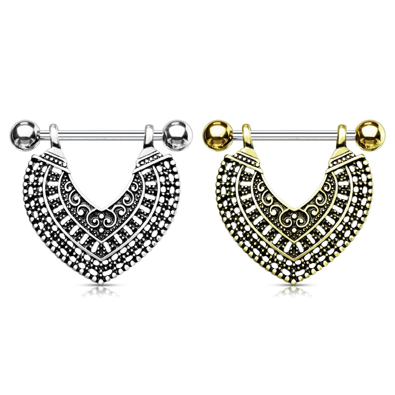 Krūtsgala pīrsings ar antīka dizaina kulonu