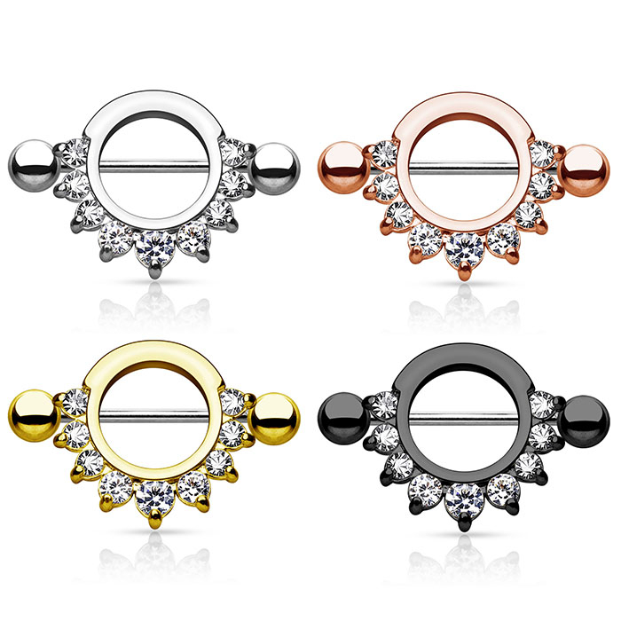 Ir laiks palutināt savu krūtsgala pīrsingu, ar jaunu, skaistu rotaslietu. Šī krūtsgala vairoga aizmugurē, atrodas taisns stienītis. Tā priekšā, vairogs tur deviņus, skaistus akmentiņus, kas rada pusmēnesi tā lejasdaļā.