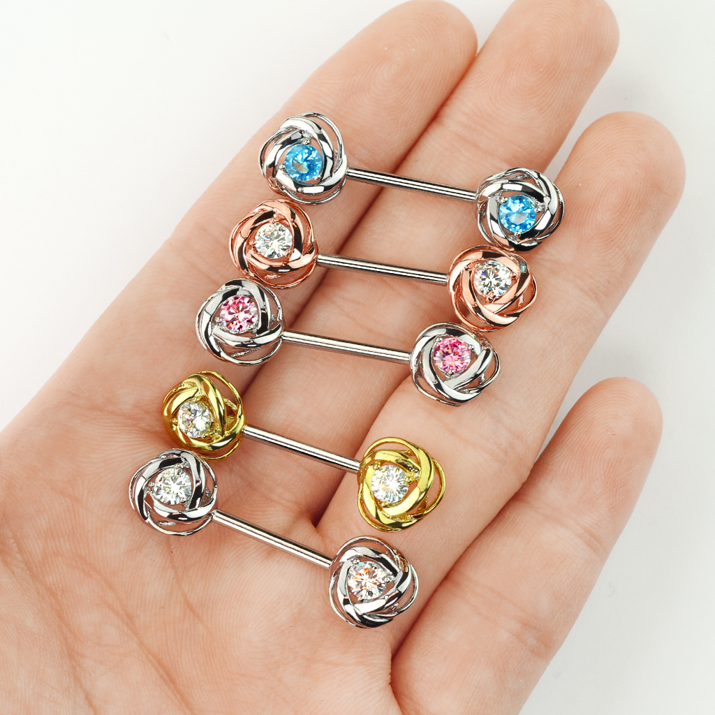 Šī izsmalcinātā un seksīgā rotaslieta izskatīies perfekti, jūsu krūtsgala pīrsingā. Taisnais stienītis ir izgatavots no kirurģiskā tērauda. Katra tā galu, rotā neliela, no misiņa izgatavota roze, ar cirkonija akmentiņu tās centrā. Visas rozes ir pārklātas ar krāsainu slāni, sudraba modelim ir metāliska krāsa, kamēr zelta un sarkanā zelta modeļiem, ir 14 karātu zelta pārklājums.