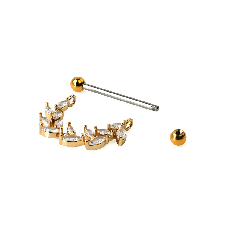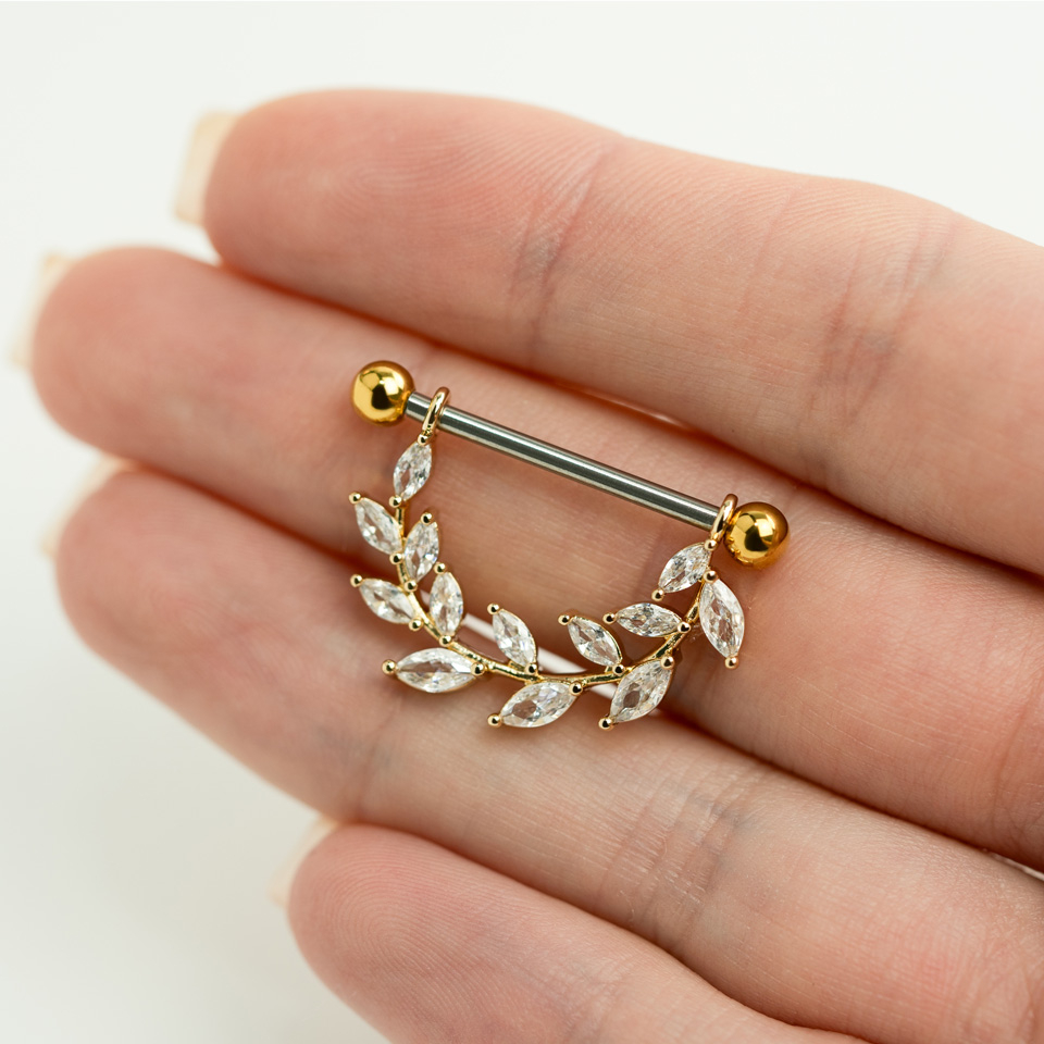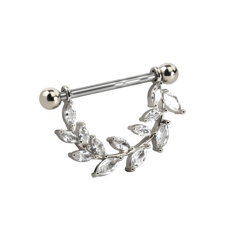 Šis krūtsgala varigos ir jums lieliski pieejams, ja vēlaties unikālu dizainu. Krūtsgala vairogs sastāv no taisa stieņa, ar bumbiņveida uzgali katrā galā. Abus bumbiņveida uzgaļus var uzskrūvēt un noskrūvēt, un, ja vēlaties, aizstāt ar cita veida uzgaļiem. No stienīša, nokarājas skaista lapa, ar nelieliem un iegareniem kristāliem. Jūs varat iegādāties šo krūtsgala vairogu trīs dažādās krāsās, ar uzgaļiem un lapā vienādās krāsās. Sudraba krāsas stienītis ir izgatavots no ķirurģiskā tērauda, neatkarīgi no izvēlētā modeļa. Tas pats attiecas uz cirkonija kristāliem: tie visi ir kristāldzidrā krāsā. Stienīša garums, kas iziet cauri jūsu krūtsgala pīrsingam, ir 5/8 collas (16 mm), pat, ja stienītis ir nedaudz garāks.