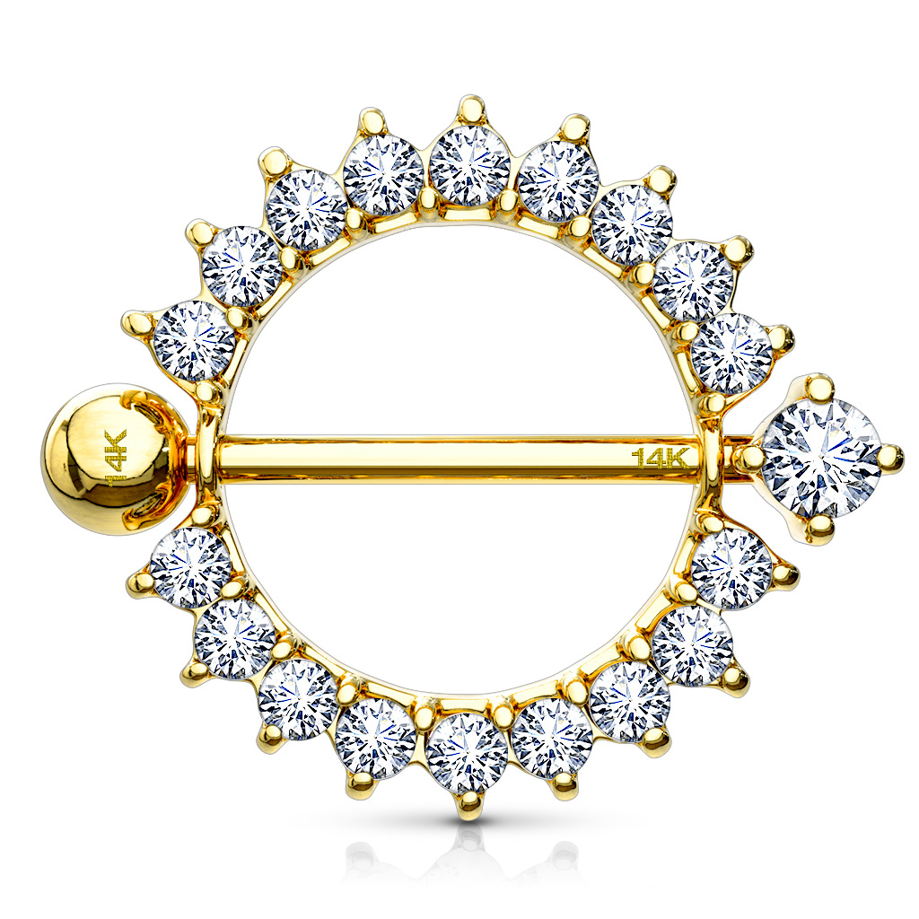 Vai esat kā traki, lai beidzot iegādātos sev jaunu, ekskluzīvu krūtsgala pīrsinga vairogu? Jums ir iespēja izgreznot savus krūtsgalus ar rotaslietām, izgatavotām no 14 karātu zelta, ar skaistiem kristāldzidriem akmentiņiem, kuri noklāj vairoga malu. Tā dizains nedaudz atgādina nelielu sauli, kurā daudz skaistu, mirdzošu akmentiņu vizuļo harmonijā. Katrs akmens ir iestrādāts struktūras pamatnē, tie nav līmēti.