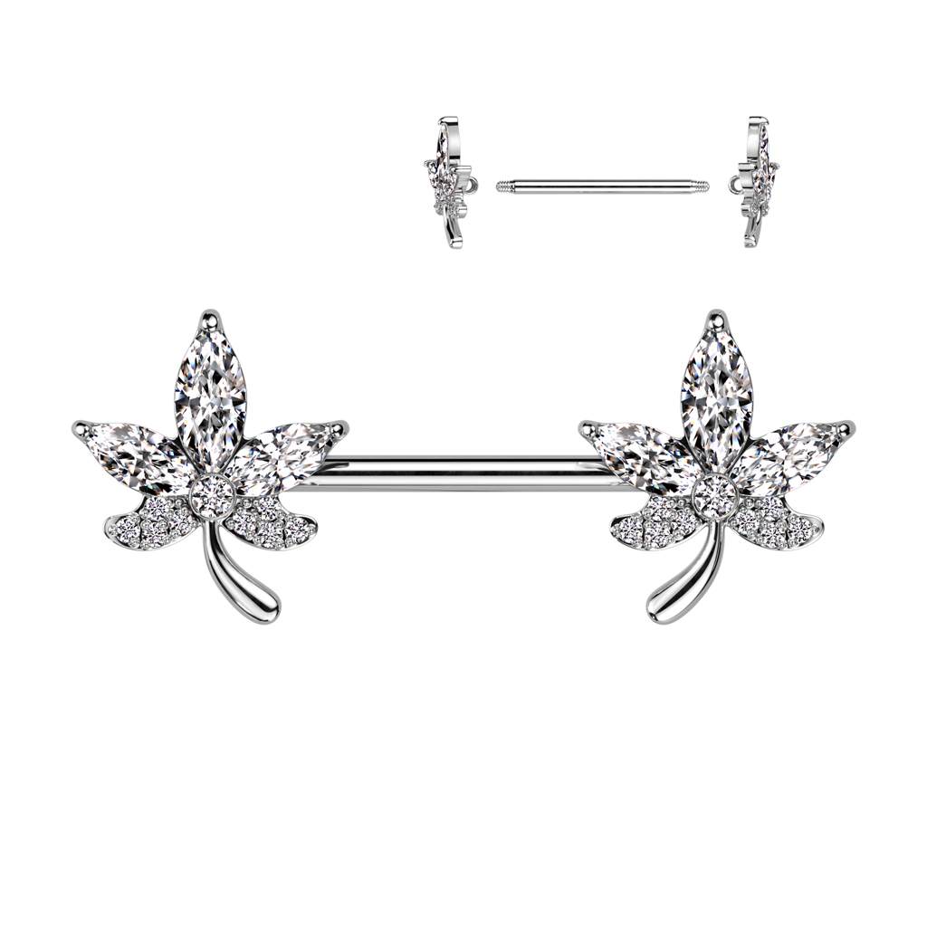 Kārojas kaut ko žilbinošu savam krūtsgala pīrsingam(-iem)? Aplūko šo krūtsgala stienīti ar dzirkstošo kubisko cirkoniju rotāto lapu, kuras kontūrai iedvesma ir gūta no saldās kļavas lapām. Tās augšdaļu veido trīs lielāki kristāli ar ovālas formas briljanta slīpējumu, savukārt apakšdaļas daivas un centrs ir noklāti ar smalkiem apļveida kristāliņiem.