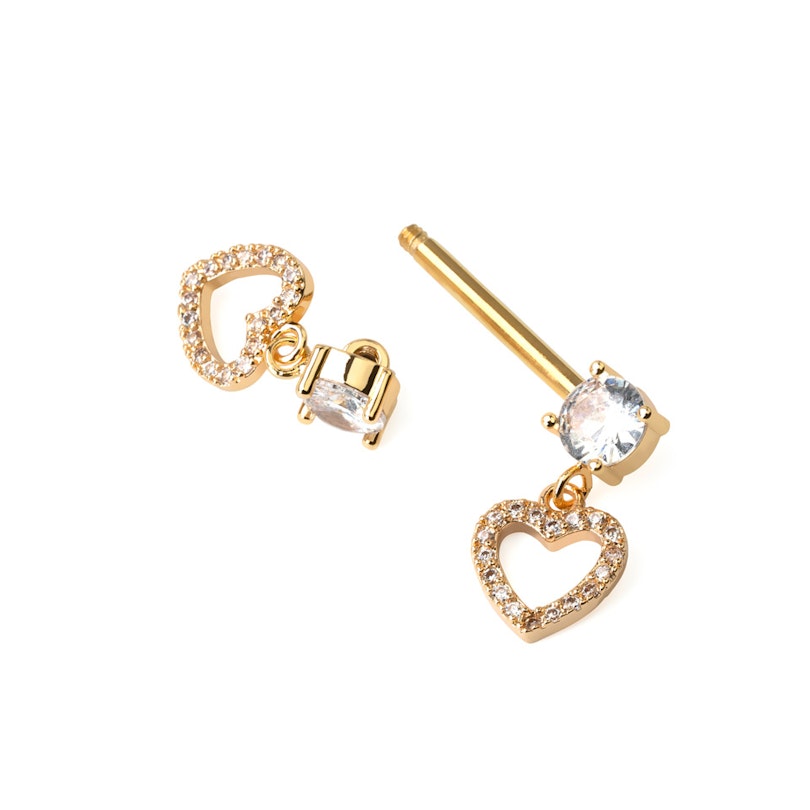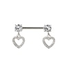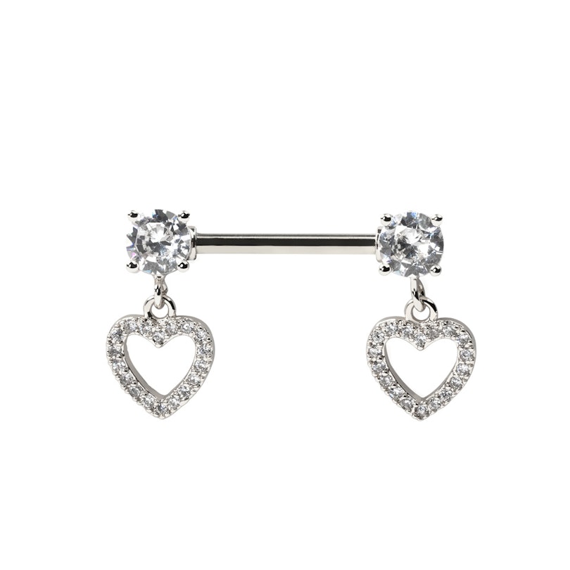 Šo skaisto krūtsgala stienīti katrā tā galā rotā cirkonija akmentiņš, pie kura ir piestiprināts apburošs sirds formas piekariņš, kas rotāts ar daudziem maziem cikronija akmentiņiem.
