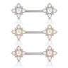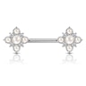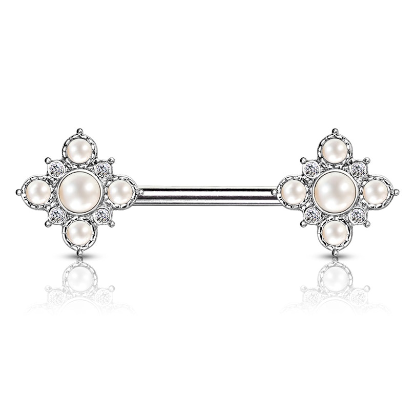 Augšā redzamais stienītis ir domāts krūtsgala pīrsingam - vai diviem caurdurtiem krūtsgaliem. Rota sastāv no taisna ķirurģiskā tērauda stieņa, kurš starp abiem ziediem ir aptuveni 1/2 collas (12 mm) garš. Tas vai tie ir, vai nav ziedi, mēs atstāsim jūsu ziņā, bet ar pielietojot nedaudz iztēles, jūs ieraudzīsiet lielu pērli zieda centrā, kur mazās pērlītes ir ziedlapiņu vietā. Starp tām ir kopumā četri mazi kristāliņi, kas padara rotaslietu vēl skaistāku.