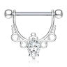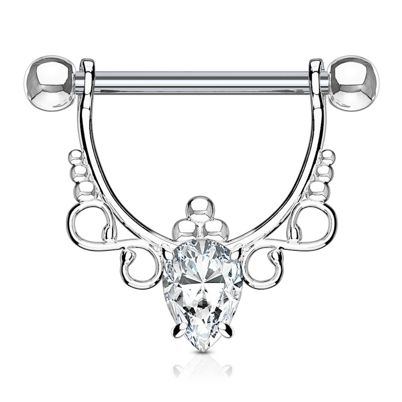 Neizsakāmi izsmalcināta rota par pieejamu cenu Tavam krūtsgala pīrsingam(-iem)! Klasisks krūtsgala vairoga dizains, kas ir papildināts ar neatkārtojamu mežģīņu rakstu. Smalkās līnijas ievijas bezgalības zīmēs, ierāmējot loka stīpas centrā esošo lāses formas kristālu, un piešķir rotai pārlaicīgu dizainu.