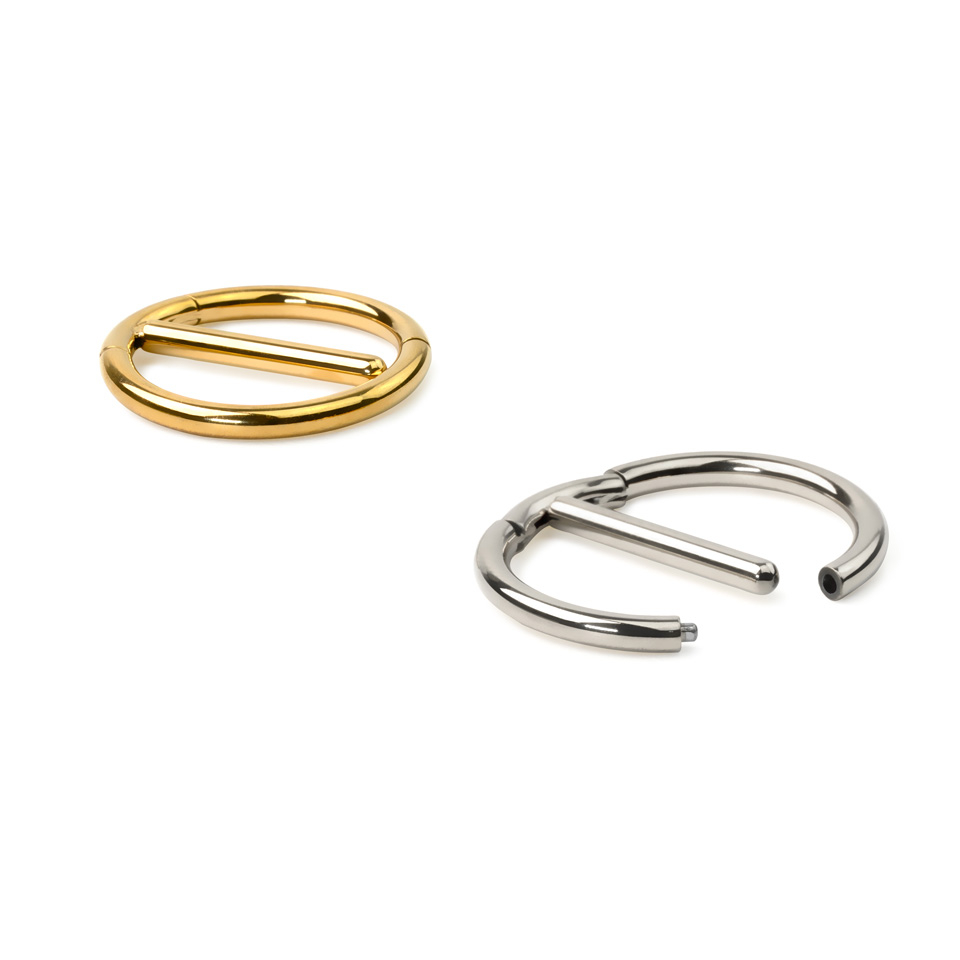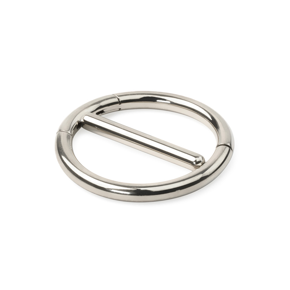 Tu noteikti novērtēsi šīs rotas pārdomāto dizainu, jo tās padara tā ievietošanu un izņemšanu neizsakāmi vieglu. Riņķi veido divi ar eņģīti kustināmi loki, kurus savieno stienītis. Vienkārši atver riņķi, ievieto stienīti pīrsingā un noslēdz riņķi apkārt krūtsgalam.
